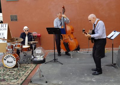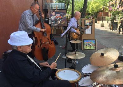 The public walking by were also uplifted with music from The Happiness jazz trio – who made people smile as they moved to the groove. The band includes Bob Sullivan on drums, David Eastlee on guitar and Roman Sirwinski on upright bass. When the band was on a break, David handed his guitar to one man who hadn’t played for awhile, and strummed a tune. He also hung out and talked to the artists, and got very revitalized.