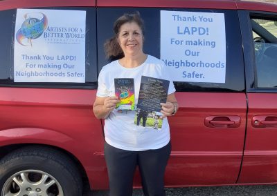 The final stop was in a parking lot in Sylmar – where we met up with other police, including Jorge Rodriguez, Deputy Chief Commanding Officer – Barbara presented him with a The Way to Happiness book and the Thank You poem. He said he is familiar with TWTH and works with Carol Lowery on a TWTH program for the police. (He has been at events at the Church of Scientology of the Valley with other police). Barbara did a short video interview with him where he talked about the importance of TWTH. And Officer Rodriguez gave her his card, and looks forward to hearing from AFABW about working together.