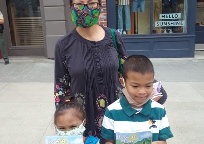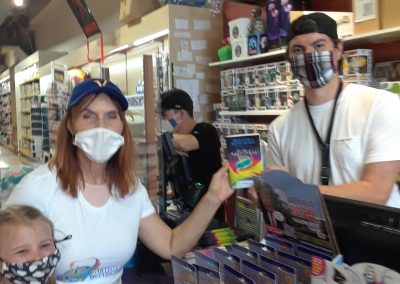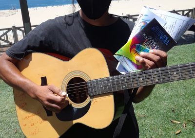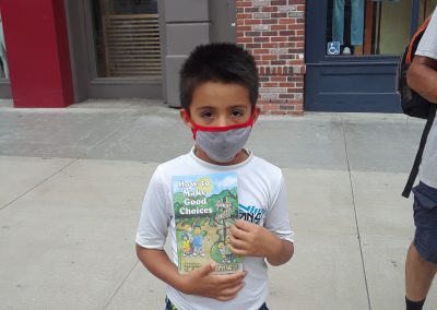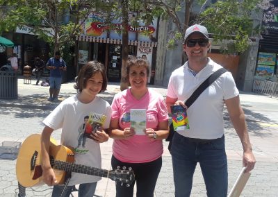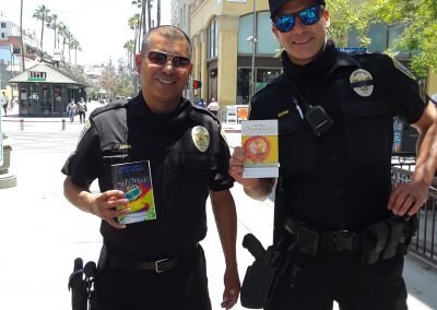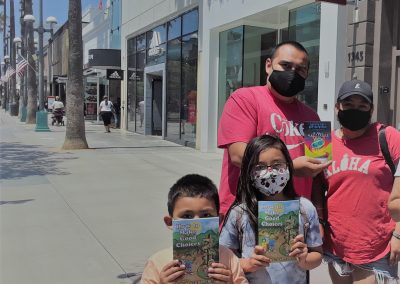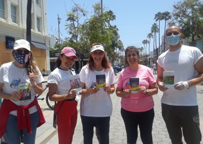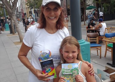 In the wake of the 2020 riots we decided to spread happiness in the LA area – and every weekend for 9 weeks we ventured out mostly to the 3rd St Promenade in Santa Monica that had been devastated by riots and boarded up. This lovely area by the beach attracts thousands of people of all ages, races, religions and cultures. We handed out books with our logo on the cover, as well as custom covers with the art by our members.